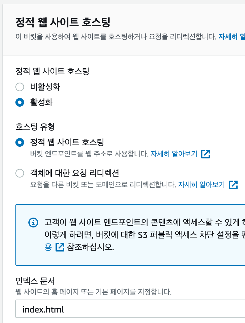 6. 인덱스 문서 이름을 index.html로 설정하고 버킷에 홈페이지로 쓸 index.html 파일을 올린다.