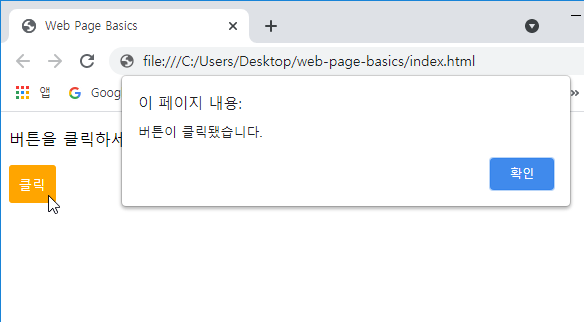 버튼을 클릭했을 때 경고창이 나타나도록 해보겠습니다.