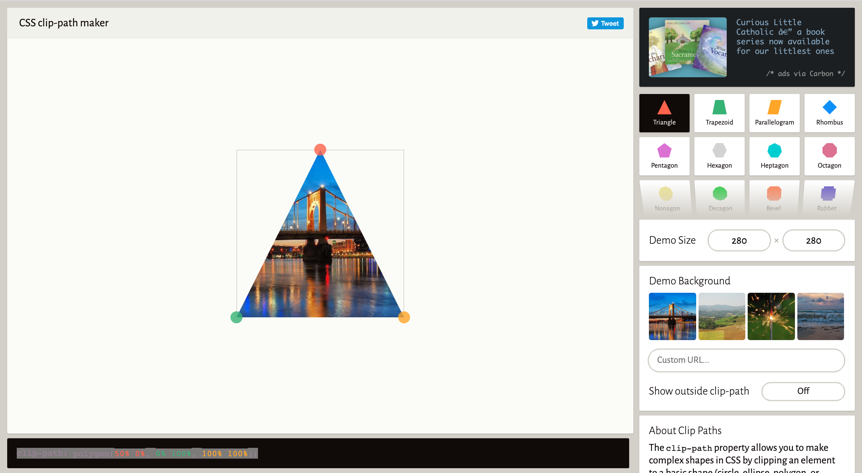 아래 사이트에서 클리핑할 모양을 만들고 img 엘리먼트에 생성된 CSS 값을 복사해 넣는다.