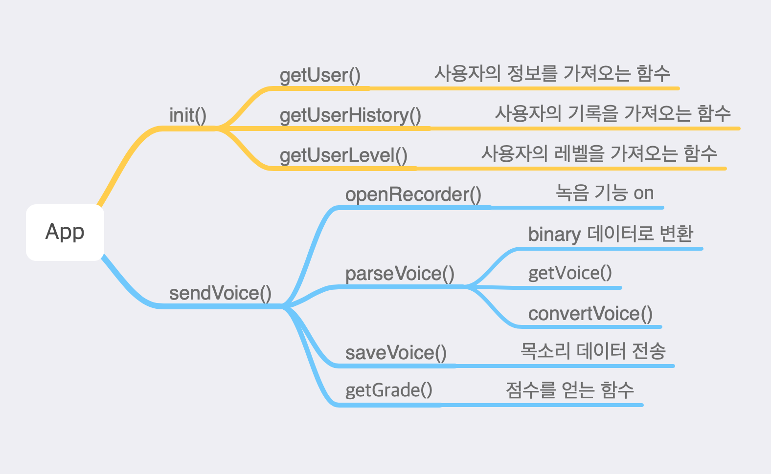 맥에서 제공하는 마인드 맵 어플(mind node)을 이용해서 각 함수가 어떤 역할을 하는지 어떤 함수를 또 호출하는지 그림을 그렸다.