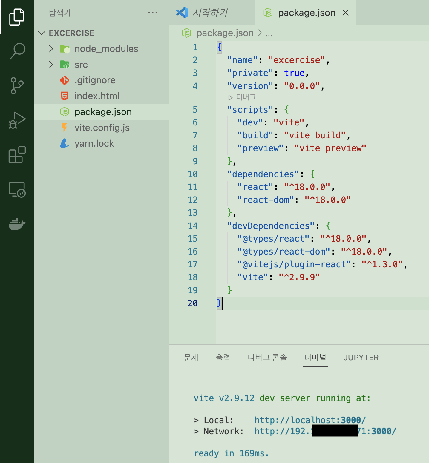생성된 프로젝트 폴더에 들어가(cd excercise) host 옵션을 줘서 앱을 실행하면